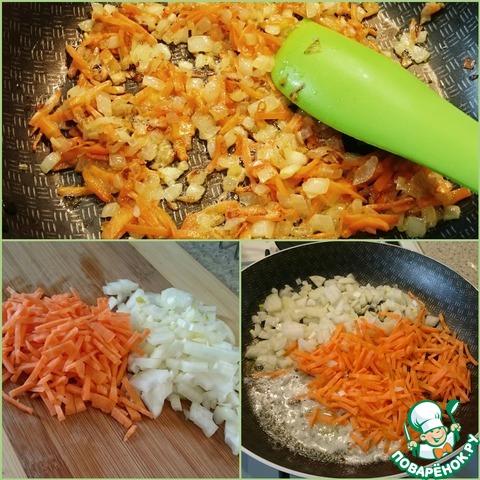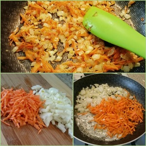 Делаем поджарку: растопим сливочное масло в сковороде, обжарим в нем лук, а через пару минут добавим морковку.