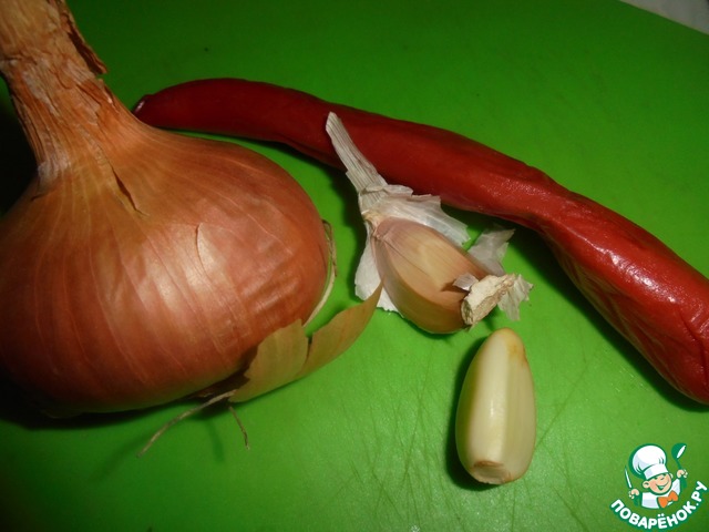Подготовьте лук с чесноком и перец чили.