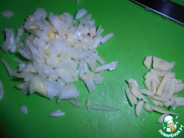 Лук очистите и мелко нарежьте. Чеснок нарежьте тонкими полоскамию