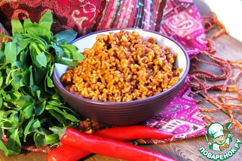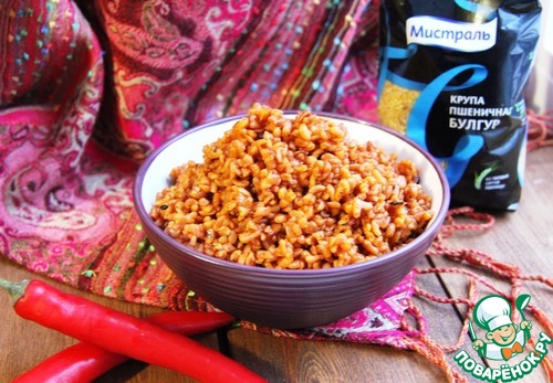 Убавить огонь и влить воду. Посолить. Готовить на медленном огне до выпаривания жидкости. От себя добавлю, если попробуете и булгур вам покажется не совсем готовым, не возбраняется еще немного добавить воды и потомить до желаемого состояния.