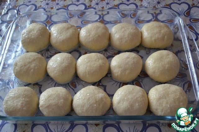 Края хорошо защипать. Выложить булочки в смазанную форму или противень. Смазать верх булочек молоком и присыпать сахаром. Поставить противень в разогретую духовку и выпекать при 180 градусах, примерно 30-35 минут. Готовность проверить зубочисткой.