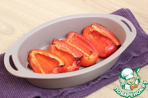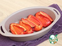 Перец болгарский мою, режу на 4 части, удаляю семена. Кладу в огнеупорную форму и запекаю в духовке при температуре 200 градусов 25-30 минут.