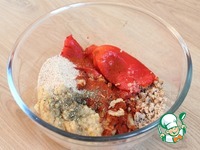 Добавляю в миску очищенный перец, чечевицу, измельченный чеснок, панировочные сухари, паприку, прованские травы. Солю по вкусу, добавляю растительное масло.
