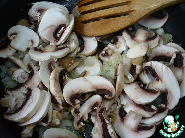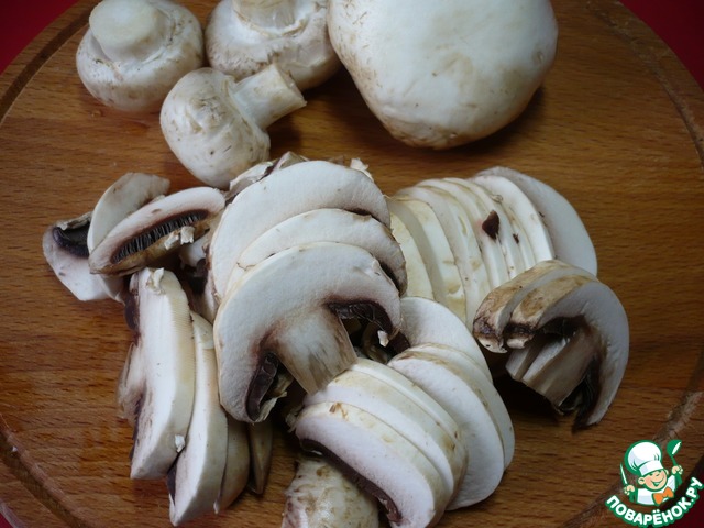 Пока варится крупа: шампиньоны помыть и тонко нарезать.