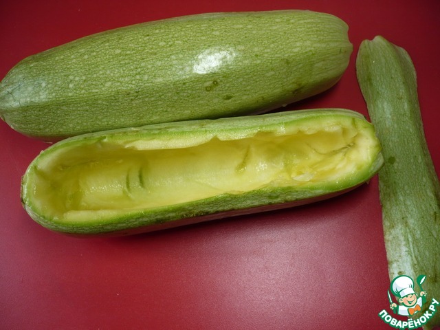 Кабачки хорошо помыть. Аккуратно срезать верхушки кабачков и выбрать ложкой большую часть мякоти (мякоть кабачков я использовала для начинки).