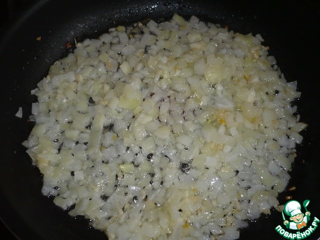 Разогреть в сковороде 3 ст. ложки растительного масла и обжарить нарезанные лук и чеснок.