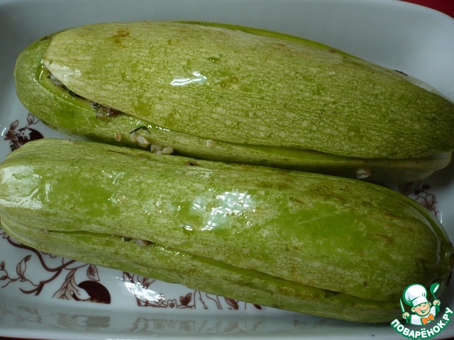 Кабачки накрываем срезанными верхушками кабачков. Уложить фаршированные кабачки в жаропрочную посуду. Смазать поверхность кабачков растительным маслом и поставить в разогретую до 200 градусов духовку, на 35 - 40 минут (до мягкости кабачков).
