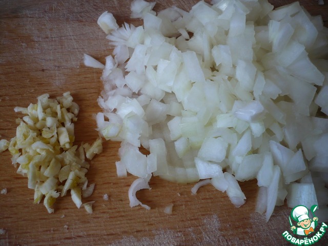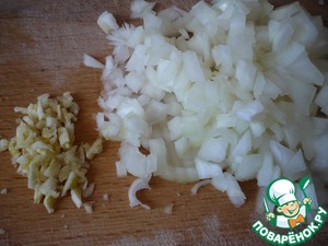 Лук и чеснок мелко нарезать. В сковороду вылить оставшиеся оливковое масло 3 ст. ложки и обжарить лук и чеснок.
