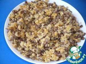 Отварить чечевицу согласно инструкции на пакете (я варила чечевицу каждую отдельно, так как время варки для каждого вида разное). Когда чечевица сварится, слить воду, смешать оба вида чечевицы (красную и зеленую), добавить 1 ст. ложку оливкового масла, еще раз перемешать и на время отставить в сторону.