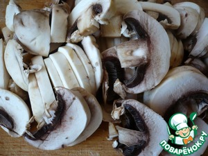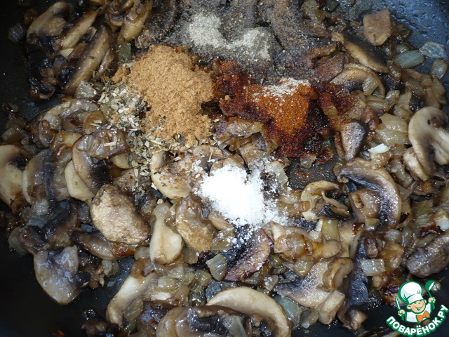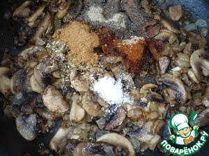 Добавляем нарезанные грибы к луку и чесноку и обжариваем до золотистого цвета и испарения влаги. В конце жарки посолить и поперчить по вкусу. Все хорошо перемешать.