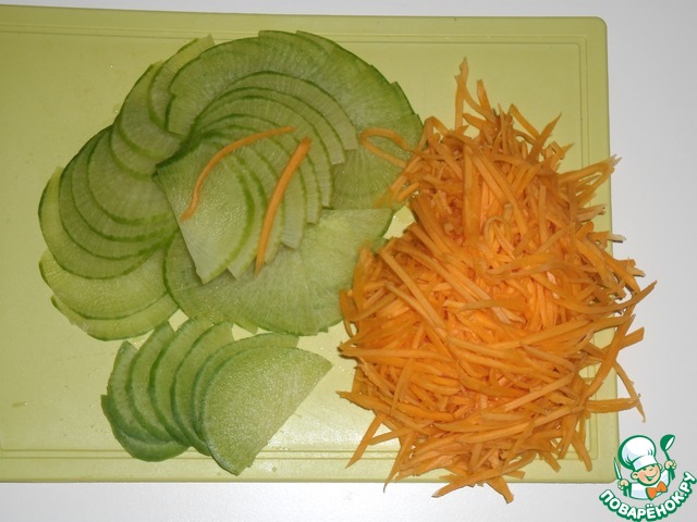 Подготовленную редьку нарезать тонкими полукольцами. Тыкву натереть соломкой.