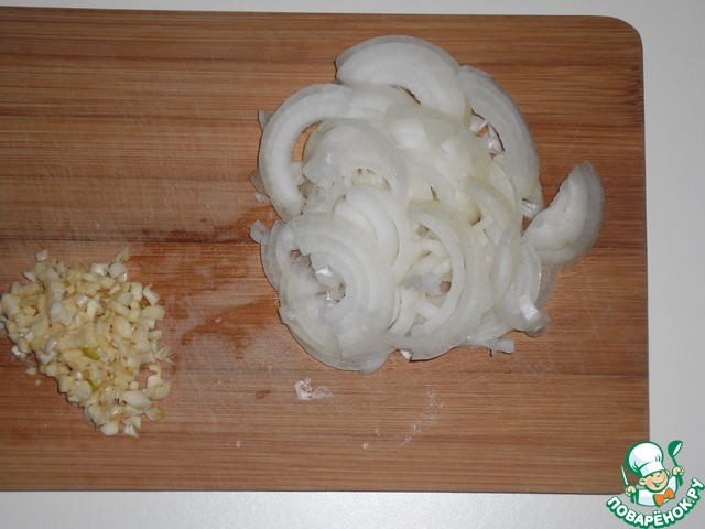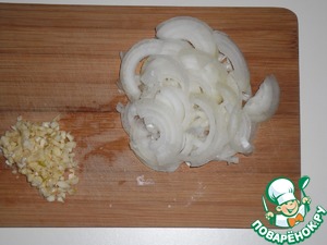 Лук нарезать полукольцами, чеснок мелко порубить.
