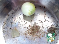 В кастрюлю поместить небольшую луковку (не обязательно, но рыбка лук любит!) и специи с лавровым листом. |