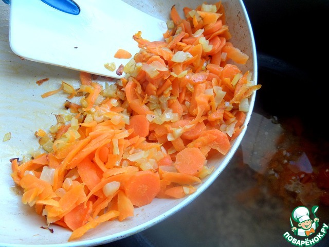 Переложить зажарку с кастрюлю, когда рис поварится несколько минут. |