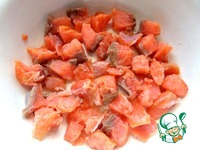 Лосось копчёный нарезать кубиком. У меня в рыбе соли было достаточно, поэтому солим по вкусу. |