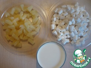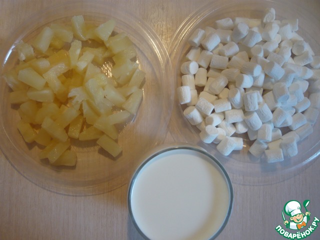- Ананас (кусочки в сиропе. В блюде сироп не используем.) — 120 г