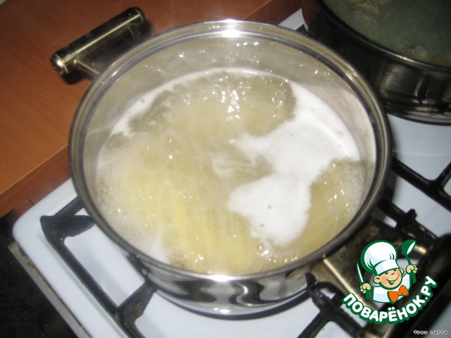Одновременно ставим кипятить воду для спагетти. Добавляем в нее соль и 1 ст.л. растительного масла (чтобы спагетти не слипались). Варим до готовности.