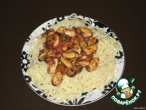 Спагетти выкладываем на тарелку, сверху кладем морепродукты в томатном соусе. И приятного всем аппетита!