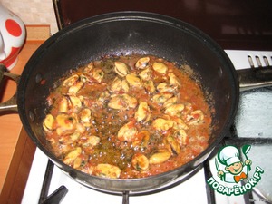 По истечении 10 минут в морепродукты добавляем томат, соль, перец и специи по вкусу. Через 5-7 минут кладем туда чеснок (мелко порезать или на чеснокодавилку).