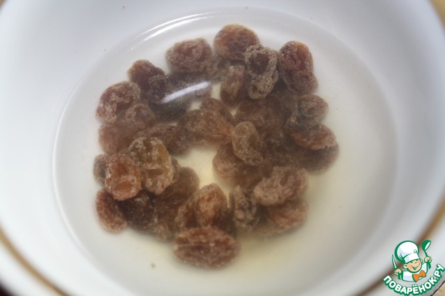 Изюм залить кипятком на 5 минут, затем воду слить.