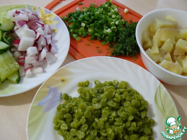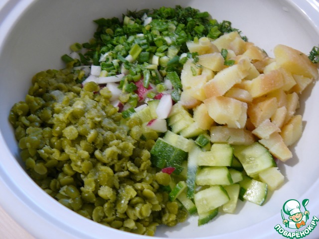 Отварной горох остудить. Картофель также остудить и порезать небольшими кубиками. Огурцы и редис порезать небольшими кубиками, зелень мелко порезать.