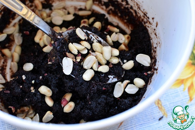 Остаток крема выложить к шоколадным крошкам. Добавить понемногу еще карамели до образования мягкого пластичного «теста». Всыпать половину крупно поломанного обжаренного арахиса и перемешать. |