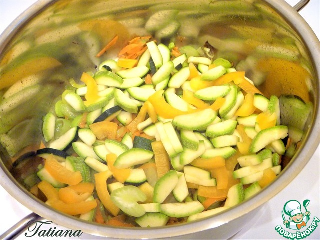 Затем добавьте кабачки и перец, также немного посолите, поперчите, перемешайте и тушите еще минут 5.