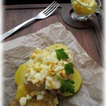 8. На тарелку выгладываем рыбу с картошкой и луком и в качестве соуса используем растопленное сливочное масло и яйцо.