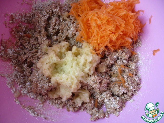 На мелкой терке натереть морковь и очищенное яблоко. Добавить в миску к овсяным хлопьям и специям. Тщательно перемешать до однородной массы.