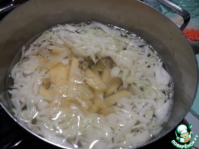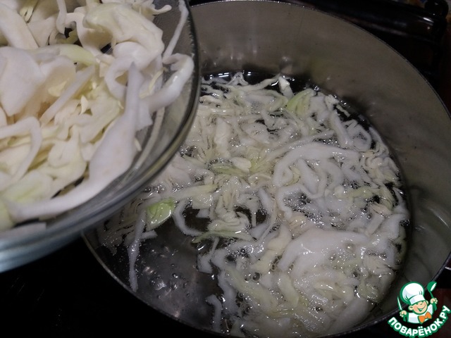 Ставим кастрюлю на огонь, наливаем в нее воду и доводим до кипения. Выкладываем капусту и снова доводим все до кипения.