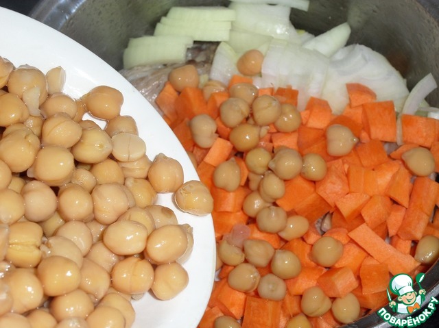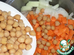 Затем добавляем в кастрюлю нарезанный овощи и вареный нут.