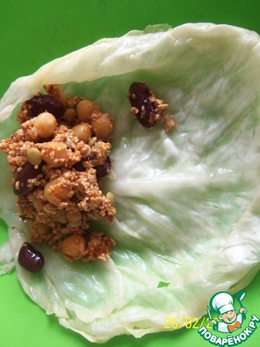 Жарим на подсолнечном масле мелко нарезанный репчатый лук с добавлением 2/3 части томатной пасты, чёрного, красного перца и соли. Жарку продолжаем до загустения томатной пасты. Добавляем чечевицу, булгур, варёные фасоль и нут соль и хорошо перемешиваем. Пока начинка остывает, приготовить заливку: оставшуюся половину томата или лечо развести в стакане горячей воды.