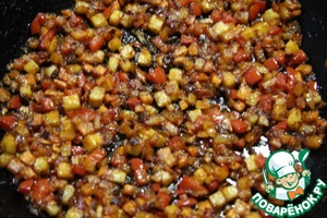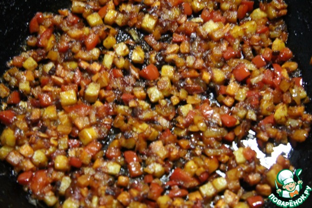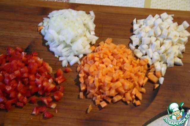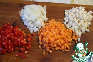 Сельдерей, морковь, лук и болгарский перец нарезать кубиками. Обжарить на растительном масле.