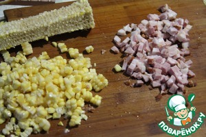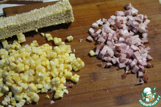 Срезать с початка кукурузу, нарезать грудинку кубиками, размером с кукурузу.