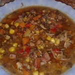 Второй вариант - обычный суп с кусочками овощей. В него так же добавить кукурузу и грудинку.