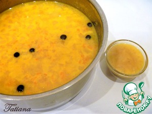... душистый перец (6-8 горошин), бутоны гвоздики (2-3 шт.), влейте апельсиновый сок (250 мл.)+горячую воду (250 мл.). Варите грушевый суп под крышкой на медленном нагреве 10 минут. Груши должны быть мягкими и полупрозрачными.