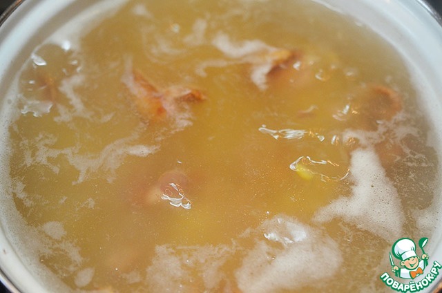 Затем воду слейте и добавьте в кипящий бульон. Варите минут 15.