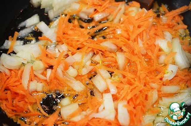 Лук нарежьте кубиком, морковь натрите на терке. Обжарьте с добавлением масла. Добавьте в суп. Варите минут 10.