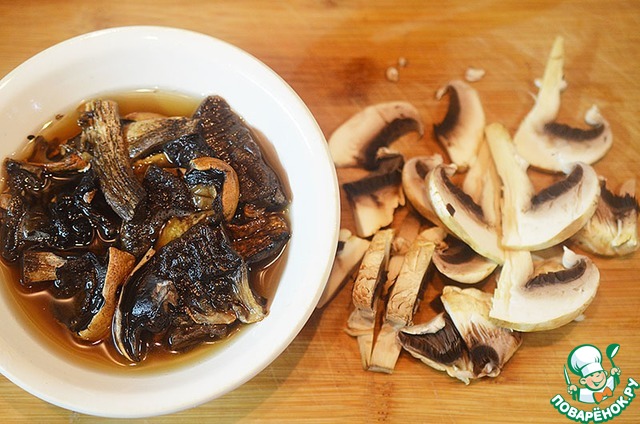 Сушеные грибы промойте и замочите в горячей воде. Свежие нарежьте ломтиками.
