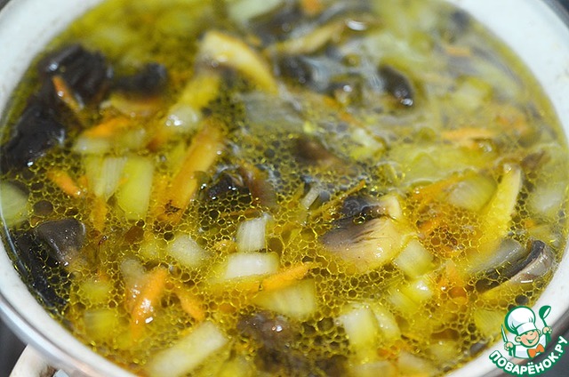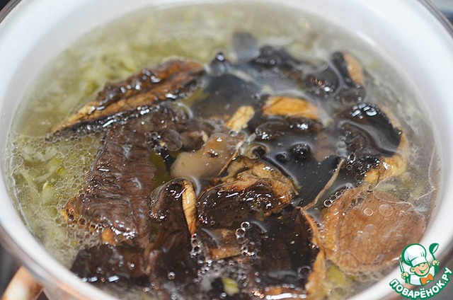 В кипящий бульон или воду положите огурцы и сушеные грибы (предварительно слив с них воду)