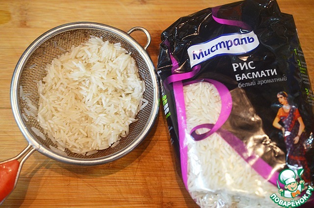 Рис промойте и добавьте в кастрюлю. Я использую рис "Басмати" ТМ Мистраль.