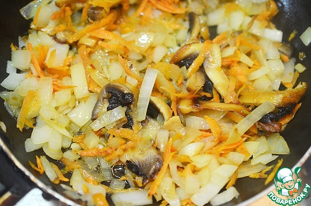 Лук, морковь и свежие грибы обжарьте с добавлением масла.