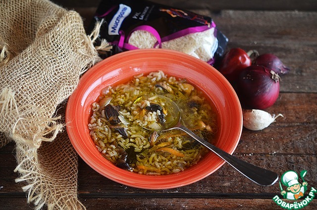 Добавьте в кастрюлю жареные овощи с грибами и варите до готовности риса.