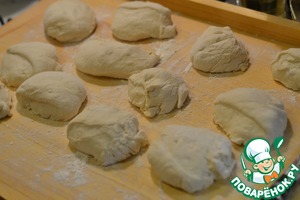 Выкладываем тесто на разделочную доску, которую мы присыпали мукой.