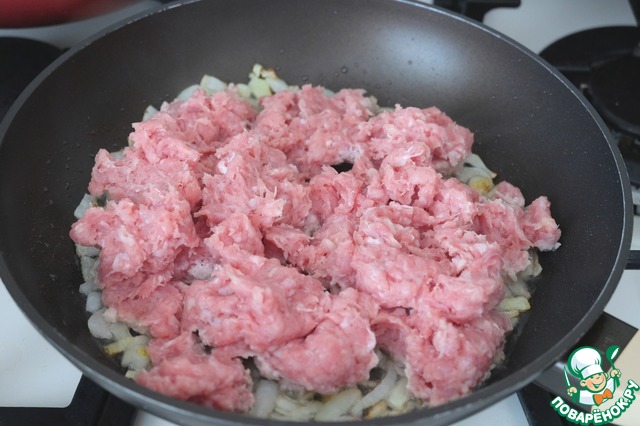 Выложить мясной фарш, разровнять.