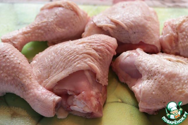 Птицу вымыть, обсушить бумажным полотенцем снаружи и изнутри, натереть солью и перцем со всех сторон.