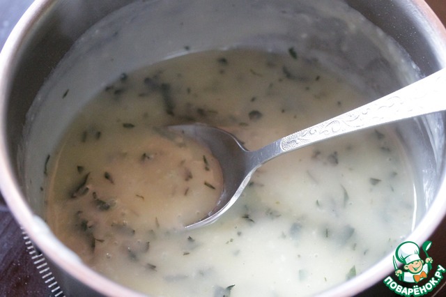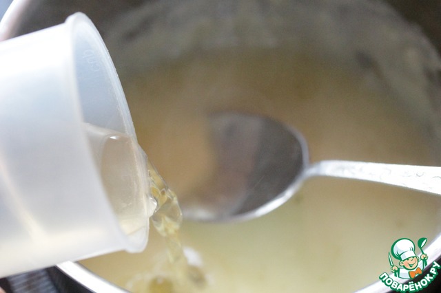 Держать на огне 3 минуты, затем влить вино, продолжая вымешивать соус венчиком.