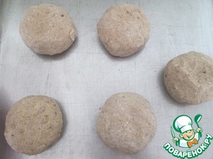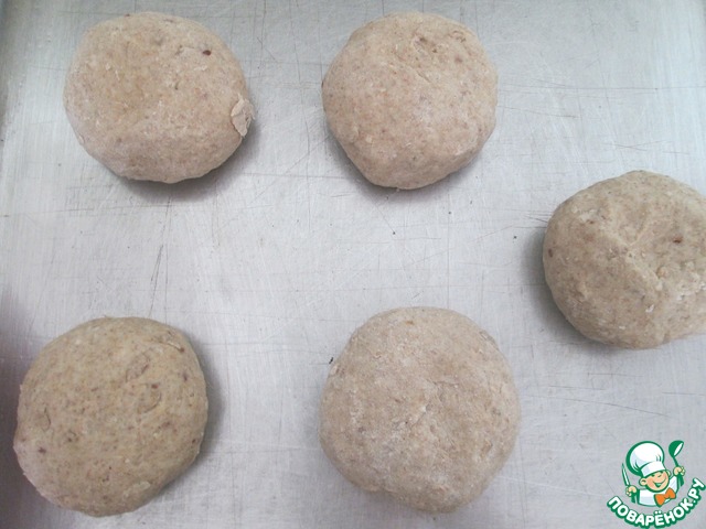 Тесто разделить на пять равных кусочков, сформировать булочки и выложить на смазанную маслом противень.