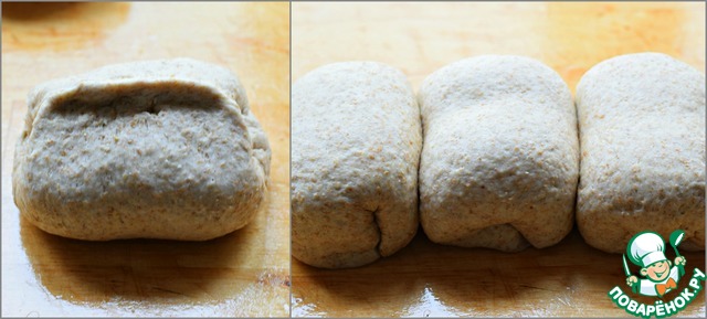 Подошедшее тесто выложить на рабочую поверхность, присыпанную мукой, слегка обмять и разделить на три равные части.