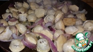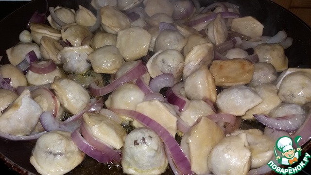 В сковороде разогреть оливковое масло, выложить нарезанный полукольцами лук и пельмени. Обжарить в течение 5 минут, после чего добавить вино.